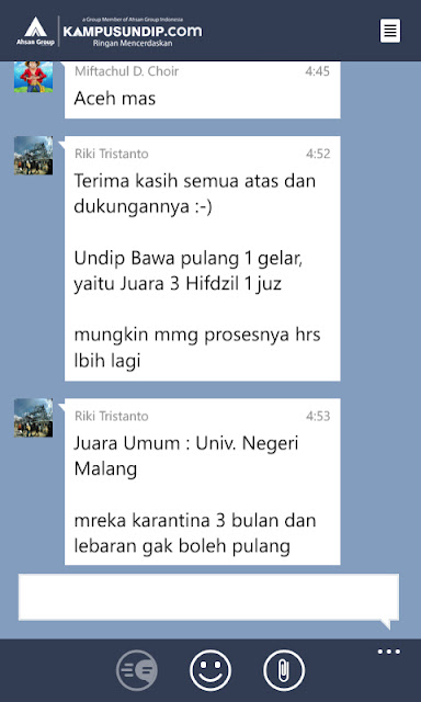 Ya, seusai MTQMN berlangsung, mahasiswa Fakultas Perikanan dan Ilmu Kelautan (FPIK) Undip yang terjun pada cabang lomba Karya Tulis Ilmiah Al-Qur’an (LKTIA) memberikan “oleh-oleh berharga” untuk dibagikan kepada rekan-rekannya, bahwa faktor yang membuat UM kembali juara adalah para mahasiswa yang akan ikut lomba dikarantina selama 3 bulan lamanya. Bahkan, mereka pun tak boleh pulang saat lebaran sekalipun.